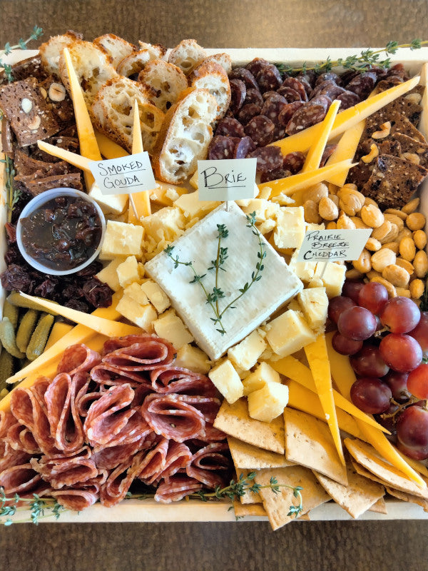 Includes 5 styles of cheese, from artisan Midwestern or European producers, choose your style. Includes and array of crackers, fruit, nuts and jam.